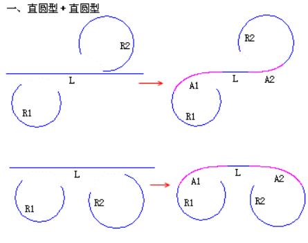 选择圆1、直线1、圆2三个实体,直线和圆1之间设计一段直缓型曲线,直线和圆2之间设计一段直缓型曲线。